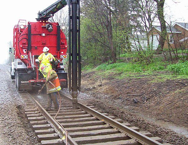 The Air-Spade® is supported by a hi-rail vacuum truck; the truck picks up the dirt and fouled ballast loosened by the Air-Spade® to clean up the area.